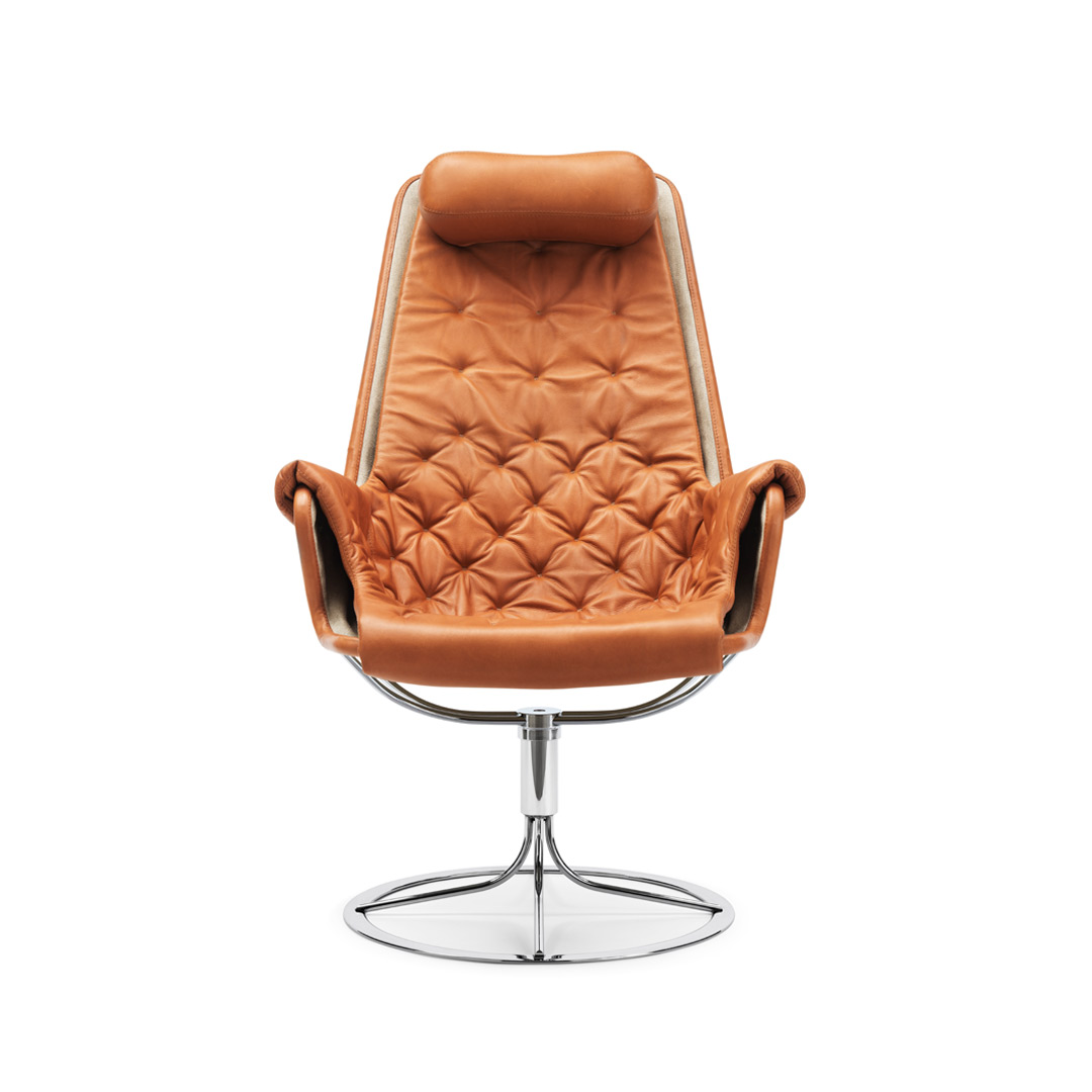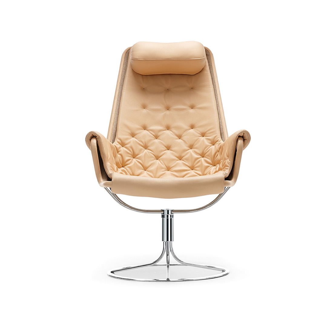 Jetson is an icon of Swedish furniture design. Bruno Mathsson spent three years working on this futuristic armchair, which takes its name from an American TV series. The result was unveiled at an exhibition at Nordiska Galleriet in Stockholm in 1969 and it was a resounding success. Jetson is a milestone in Bruno Mathsson’s production program and it’s had many imitators. A bowl-shaped seat and a high ergonomically-designed back with headrest. A base with a unique memory function, meaning the chair rotates back to its original position.