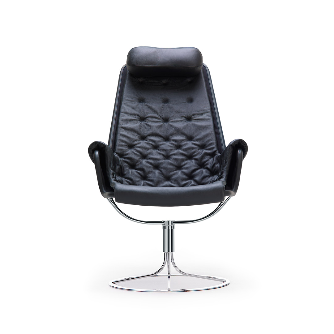 Iconic easy chair designed by Bruno Mathsson. The Jetson chair reflects both his obsession with comfort and a classic Swedish modern design approach. It features a bowl-shaped seat, ergonomically designed high back with head pillow. Chrome swivel base with a unique self-return mechanism.