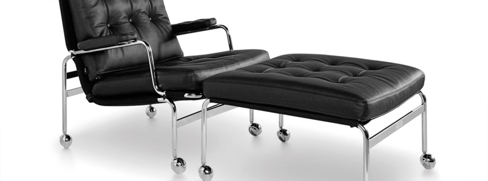 This classic elegant stool was designed by Bruno Mathsson in 1969 and was the first item of furniture in a successful collaboration that lasted for several decades. Comfortable stuffed cushions rest on a chrome-plated frame with supporting web.